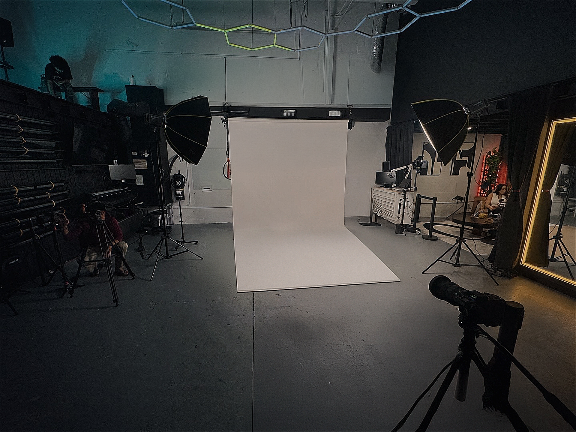A fully equipped photo creative studio designed to elevate your vision, featuring an array of premium, professional-grade studio lights and equipment. Every detail has been curated to give you absolute control over lighting, angles, and composition, ensuring your shots achieve unmatched precision and quality.